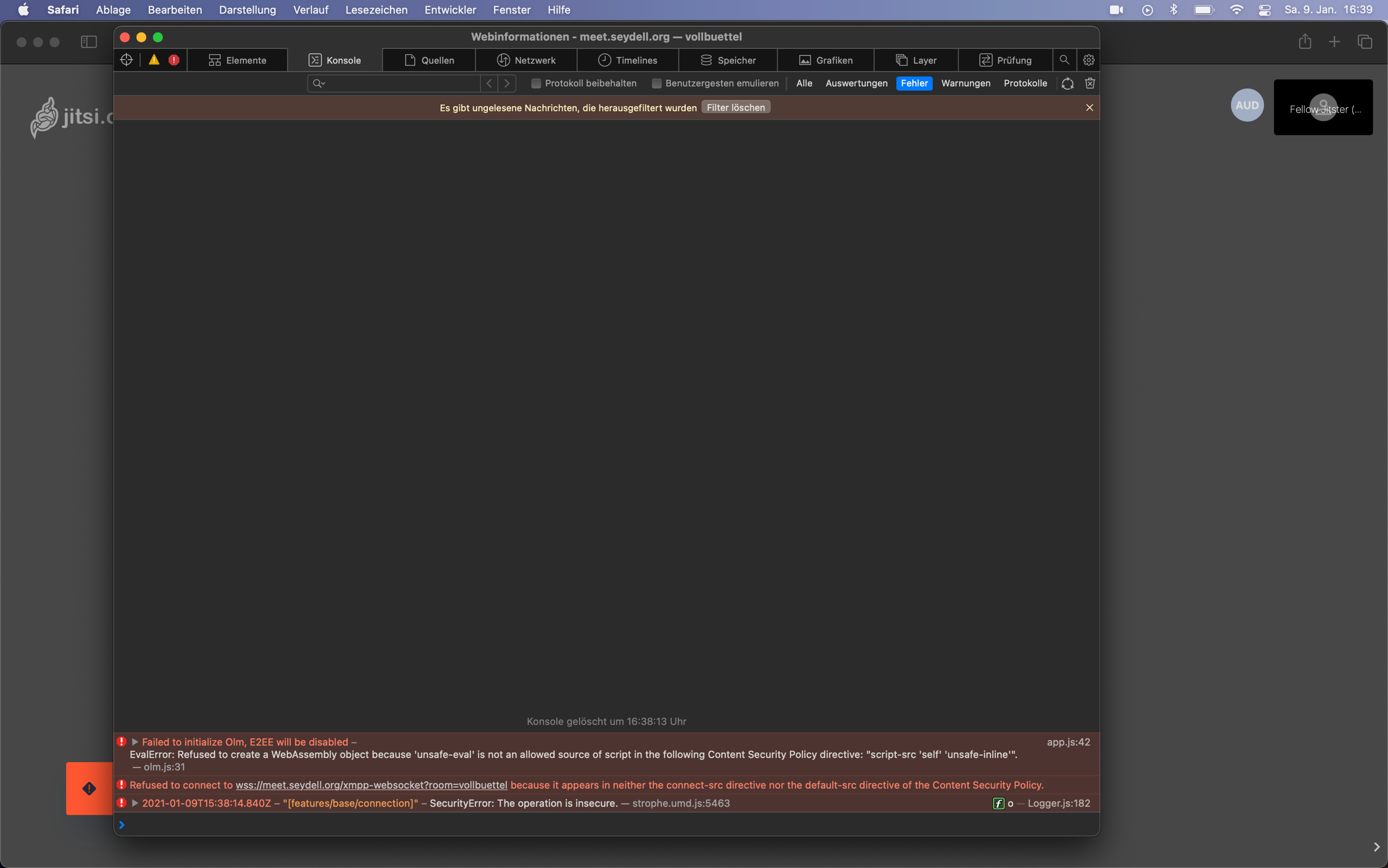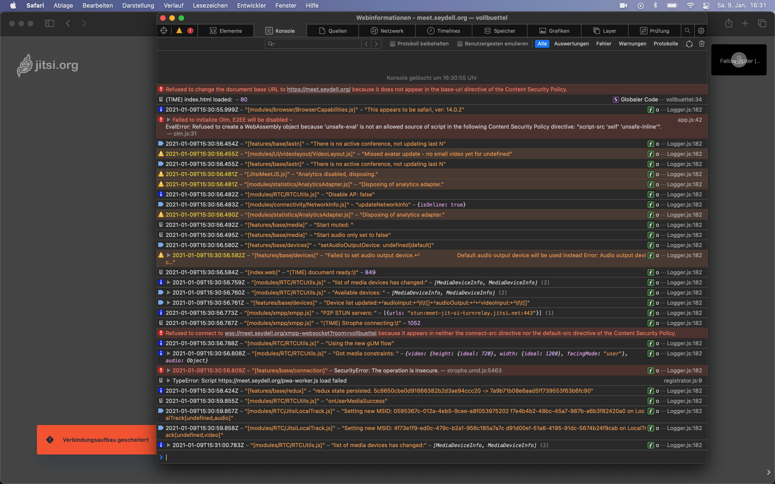 Still not working. Although FF and Chrome setups work, I see CSP related error messages there, too - only that they do not seem as restrictive as Safari is... So my best guess currently is that in general the CSP configuration of Traefik is broken in my multitenancy setup. This is the relevant part of the jitsi/web instance in my adjusted docker-compose.jitsi.yml.j2: